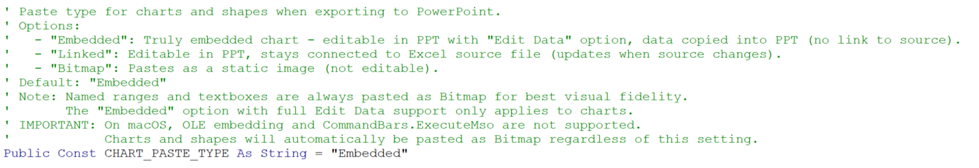 - "Embedded" (default): Charts are truly embedded in PowerPoint with